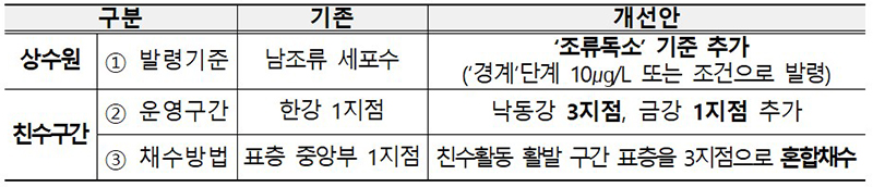 이번 개선안은 ‘경계’ 단계 발령 시 남조류 세포수뿐만 아니라 조류독소를 추가로 측정해 10㎍/L을 초과하는 경우에도 경보를 발령하기로 했다.