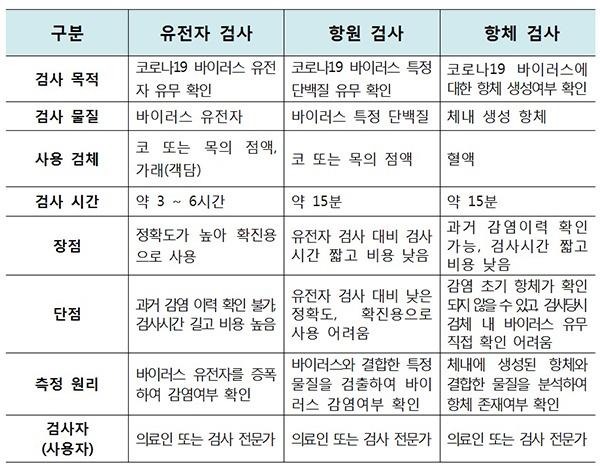 코로나19 진단시약은 검체 내의 바이러스 유무를 확인하는 ‘유전자 진단시약(RT-PCR)’, ‘항원진단시약’과 검체 내의 바이러스에 대한 항체 유무를 확인하는 ‘항체진단시약’ 등 3종류다.