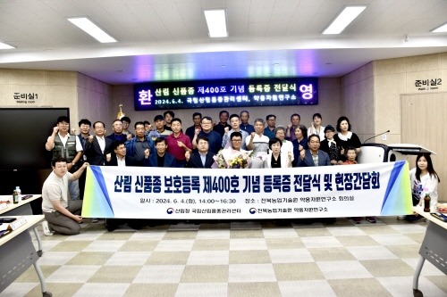산림청 국립산림품종관리센터는 산림분야 품종보호등록 제400호를 기념하여 등록증 전달식 및 개인·지자체 육종가 현장 간담회를 4일 전북농업기술원 약용자원연구소(진안)에서 개최하였다.