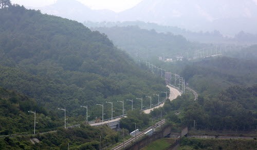 강원도 고성군 통일전망대에서 바라본 동해선 철로와 육로