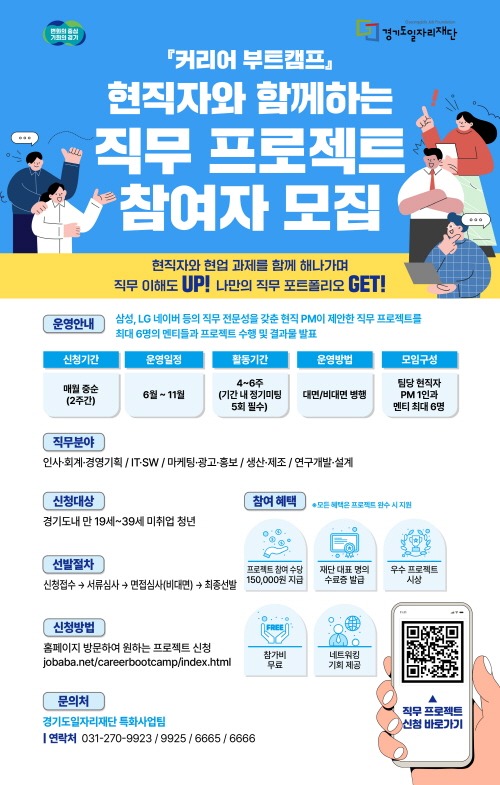 이번 프로젝트 참여 관련 자세한 사항은 잡아바 어플라이를 확인하거나, 경기도일자리재단 특화사업팀(031-270-6666/6665)으로 전화 문의 가능하다.