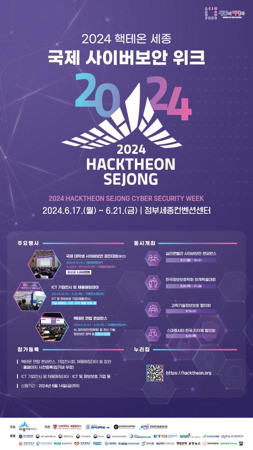 세종특별자치시가 오는 17일부터 21일까지 5일간 정부세종컨벤션센터에서 ‘2024 핵테온 세종 국제 사이버보안 위크’를 개최한다.