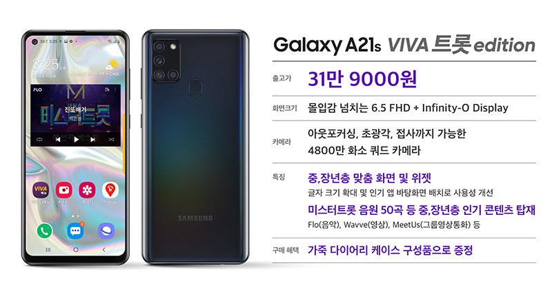 ‘A21s VIVA 트롯’은 출고가에 31만9000원에 중장년층이 보기 편한 6.5인치 HD+ 급 디스플레이와 아웃포커싱, 접사 등이 가능한 4800만 화소 쿼드 카메라를 장착한 가성비 좋은 스마트폰이다.