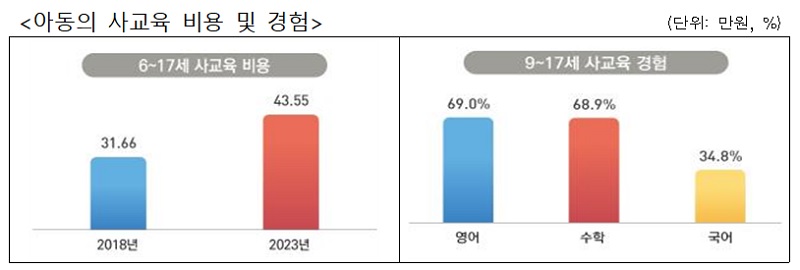 6~17세 평균 사교육 비용은 2018년 31만 6600원에서 2023년 43만 5500원으로 크게 증가한 것으로 나타났다.