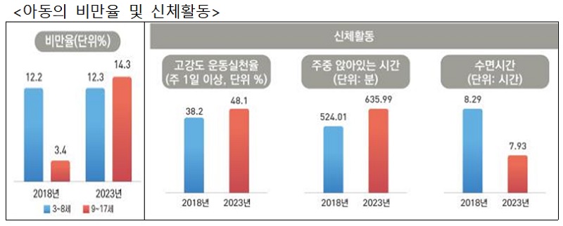 아동의 체중과 연관된 지표로 고강도 운동 실천율은 48.1%로 다소 개선됐지만 수면시간(7.93시간)은 줄어들고 주중 앉아있는 시간(636분)은 증가했다.