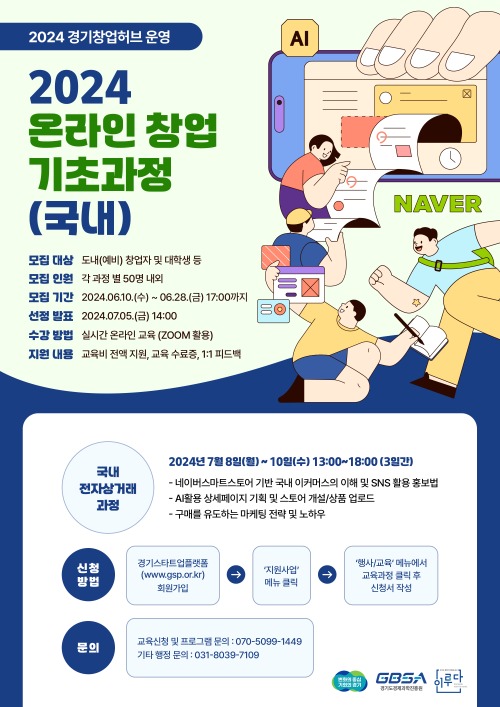 경기도와 경기도경제과학진흥원이 예비창업자들이 손쉽게 국내외 온라인 상거래 분야 창업을 할 수 있도록 교육하는 ‘2024년 온라인 창업 기초 과정’ 수강생을 28일까지 모집한다.