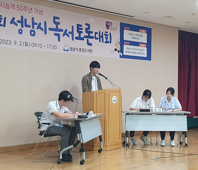 성남시 청소년들이 자신과 다른 관점을 가진 상대방의 의견을 수용 · 존중하는 자세를 배우고 , 비판적이고 창의적인 사고력을 키우는 계기 마련을 위해 올해로 11 회째 독서토론대회를 열어오고 있다 .