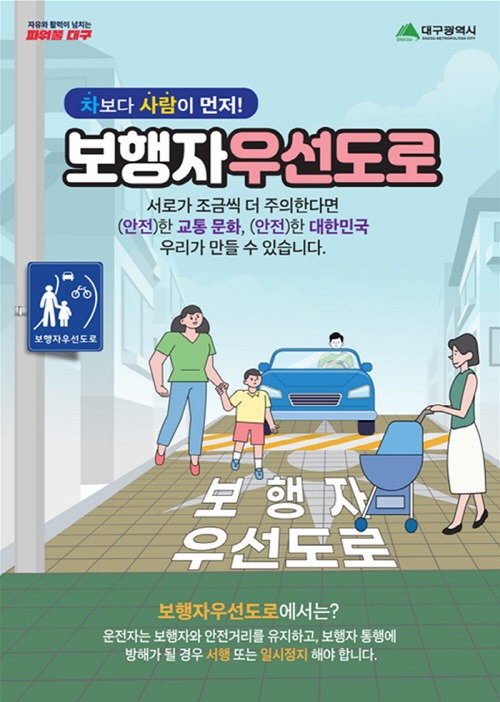 이에, 대구광역시는 보행자우선도로에서 운전자들이 지켜야 할 의무와 보행자의 인식개선을 위한 홍보 캠페인을 주기적으로 실시해 보행자우선도로의 실효성을 더욱 넓혀갈 계획이다.