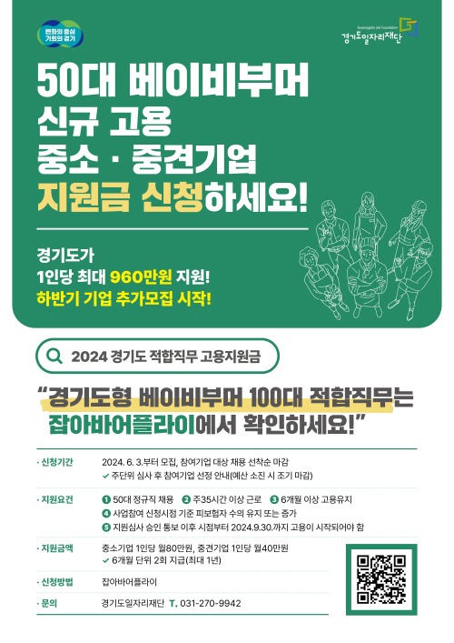 이 사업은 50대 도민을 경기도형 베이비부머 100대 적합직무에 해당하는 정규직으로 채용하는 도내 중소·중견기업에 1인당 최대 960만 원을 1년간 지원한다.