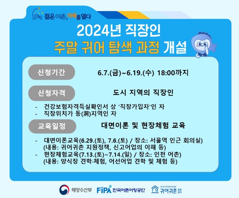 교육 정원은 25명이며, 洞 지역의 직장에서 재직 중인 자만 신청할 수 있다. 오는 6.19.(수)까지 귀어귀촌 종합정보 플랫폼(www.sealife.go.kr)을 통해 접수를 받고, 귀어의지 등을 평가하여 6.27.(목) 최종 교육생을 선발한다.