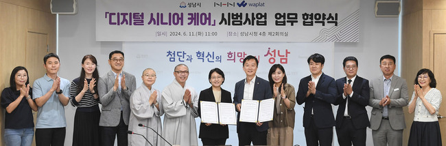 시는 6 월 11 일 오전 11 시 시청 4 층 제 2 회의실에서 이진찬 성남부시장과 황선영 와플랫 대표이사 , 노인종합복지관 관장 등이 참석한 가운데 ‘ 디지털 시니어케어 시범사업 시행을 위한 업무협약 ’ 을 했다 .