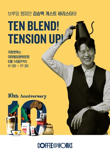 이번 행사는 14일 오전 11시 30분부터 오후 5시 30분까지 이마빌딩광화문점에서 '텐 블렌드, 텐션 업! TEN BLEND TENSION UP!'이라는 주제로, 커피앳웍스 10주년 기념 원두인 '텐 블렌드(Ten Blend)'를 다채롭게 고객에게 소개한다. 김승백 바리스타가 직접 개발한 레시피인 ▲케멕스 브루잉 커피 ▲에스프레소 메뉴 3종(에스프레소, 아메리카노, 카페라떼) ▲10주년 플래터(컵브루잉커피, 크림라떼, 바움쿠헨)를 행사 한정 메뉴로 운영하고, '케멕스 브루잉'을 주제로 커피 세미나를 진행한다.