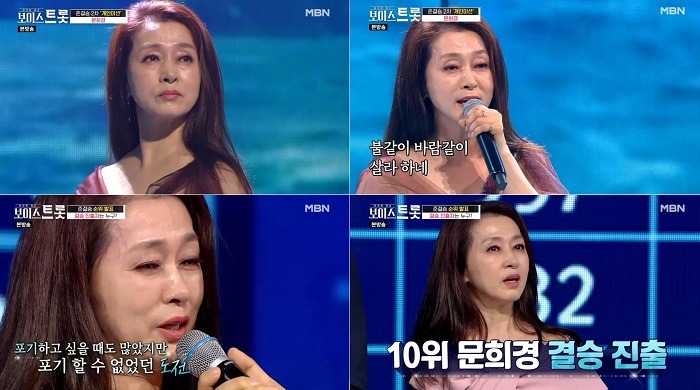 이로써 문희경은 TOP10에 오르며 결승 진출권을 거머쥐었다. 매주 끊임없이 파격적인 변신을 시도하며 중년들의 워너비로 자리매김한 문희경이 보여줄 결승전 무대에 기대감이 최고조에 달하고 있다.
