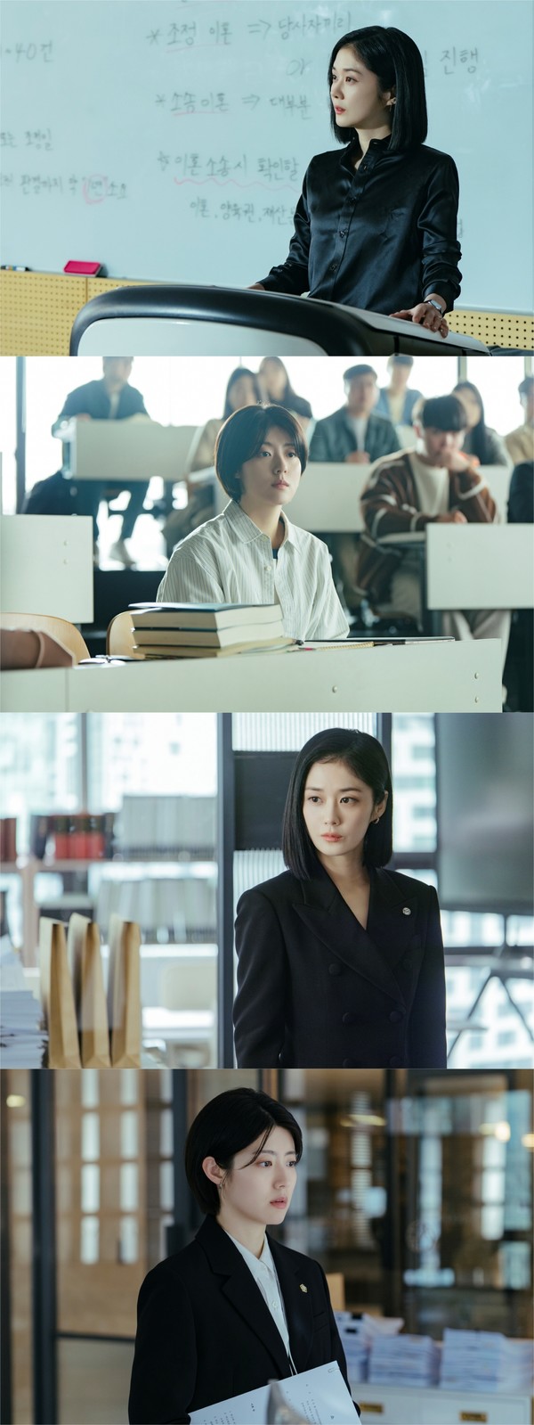 그런 가운데 공개된 차은경과 한유리의 스틸은 ‘단짠’ 워맨스에 대한 기대감을 한층 끌어올린다. 차은경과 한유리는 첫 만남부터 스파크가 터진다. 로스쿨 특강에 나선 이혼전문변호사 ‘차은경’은 한 치의 흐트러짐 없는 모습.
