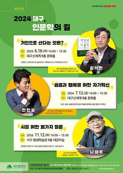 김종찬 대구광역시 대학정책국장은 “대구광역시가 2024 기획특강을 통해 시민들이 인문학을 일상에서 편하게 접하고 평생교육의 기회를 확대하는 데 힘이 되어드리고자 한다”며, “많은 분들이 이번 기획특강을 통해 삶의 지혜를 얻고 배움의 즐거움을 느껴보시길 희망한다”고 말했다.