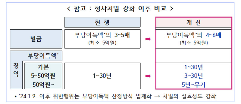 벌금형은 현행 부당이득액의 3~5배에서 4~6배로 올리고 부당이득액이 5억 원 이상인 경우에는 징역을 가중하도록 해 불법 공매도와 불공정거래의 처벌체계를 일치시킨다.