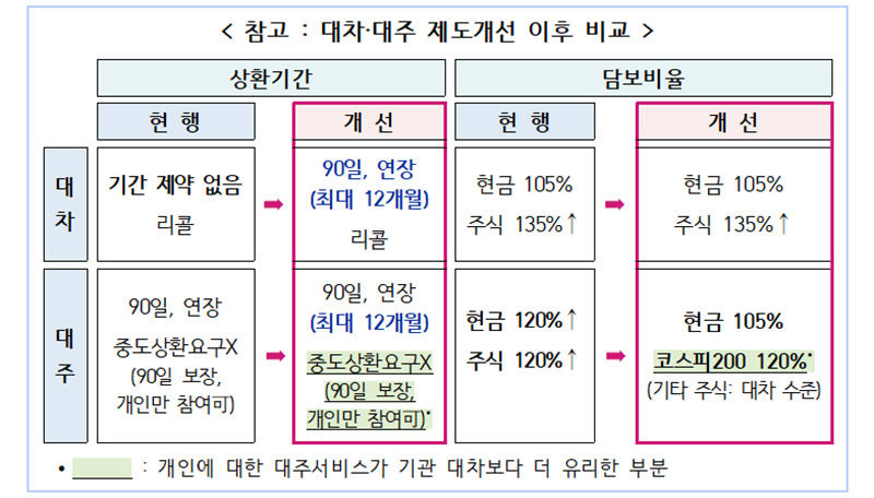 개선 방안은 대주서비스의 담보 비율을 대차거래와 동일하게 현금 105%로 인하하되, 코스피200 주식은 120%를 유지해 개인투자자의 거래 조건이 더욱 유리해지게 된다.