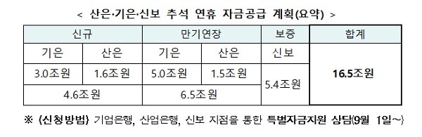 신용보증기금은 역시 10월 19일까지 추석 전후 예상되는 대금결제, 상여금 지급 등 소요자금 증가에 대응해 5조4000억원 규모의 보증을 지원한다. 신규보증이 1조5000억원, 만기 연장이 3조9000억원이다.