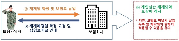 이를 위해 보험회사는 재개예정일의 31일 전까지 보험계약자에게 재개일 확정을 요청하고, 예상 납입 보험료를 안내한다.