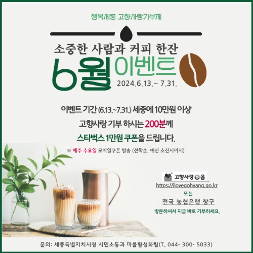 세종특별자치시가 세종 고향사랑기부제 참여 독려를 위해 내달 31일까지 ‘소중한 사람과 커피 한잔’ 이벤트를 진행한다.
