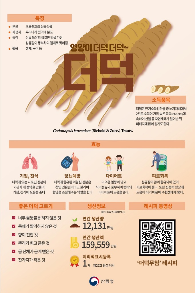 남성현 산림청장은 “국민 모두가 청정하고 건강한 우리 임산물을 즐길 수 있도록 다양한 활용법을 선보일 예정이다”라며 “피로회복에 좋은 더덕 많이 드시고 원기충전해 건강한 여름 나시기를 바란다”고 말했다.