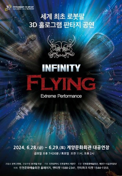 인천문화예술회관이 개관 30주년을 맞이해 계양구 시설관리공단과 함께 국내 최고의 익스트림 퍼포먼스 <인피니티 플라잉>을 초청한다. 인천문화예술회관의 리모델링 공사로 인해 계양문화회관 대공연장에서 관객들을 만난다.