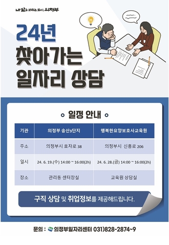 찾아가는 일자리 상담은 의정부 시민 누구나 이용 가능하며, 상담 신청 관련 문의는 전화(031-828-2874)로 안내받을 수 있다.