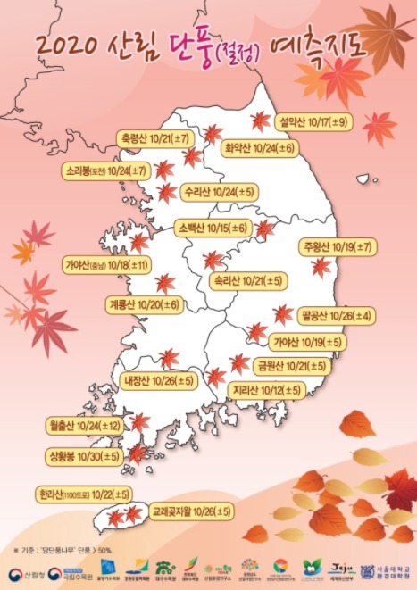 올해 단풍은 지리산(10/14, ±5일), 소백산(10/15, ±6일), 설악산(10/17, ±9일)에서 가장 빠르게 절정을 관찰할 수 있을 것으로 보이며, 전라남도 상황봉(완도)이 10/30(±5일)로 예측된 지역 중 가장 늦게 단풍이 드는 것으로 분석되었다.