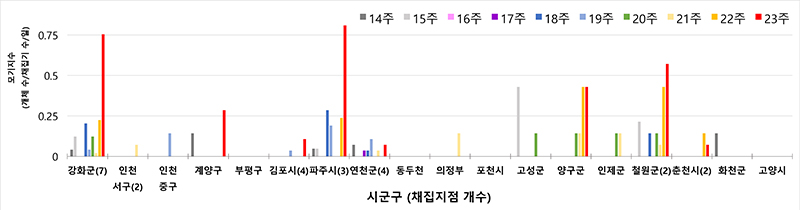 한편 말라리아 위험지역 53개 시군구 내 61개 지점에서 23주 차 매개모기 밀도 감시 결과, 하루 평균 모기지수가 0.5이상인 지역이 강화군(0.8), 파주시(0.8), 철원군(0.6)으로 말라리아 주의보 발령 기준을 충족했다.