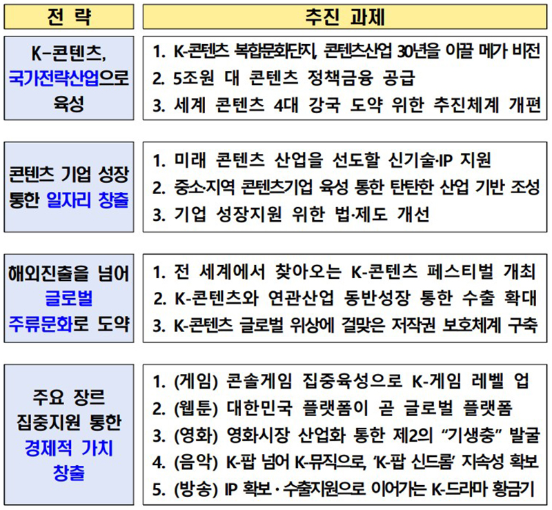 게임·웹툰·영화·음악·방송 등 콘텐츠 핵심 장르를 집중 지원해 케이-콘텐츠의 경제적 가치를 창출한다.