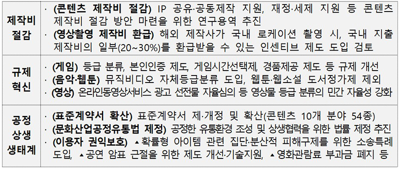 게임·음악 등 콘텐츠 기업에 대한 제작비 절감 지원 방안을 마련하고, 체감도 높은 콘텐츠 산업 규제 혁신과제들을 발굴해 콘텐츠 기업의 성장을 제도적으로 뒷받침할 계획이다.