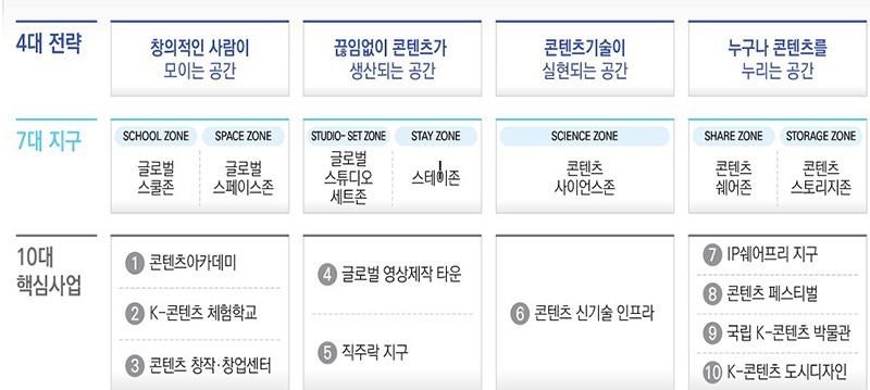 또한 기업·대학·연구소 등이 총집결해 콘텐츠 생산·유통·소비가 한곳에서 이루어지는 문화·산업 복합단지를 조성하고, 콘텐츠 기업은 성장단계별로 지원한다.