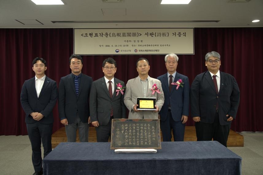 국가유산청(청장 최응천)은 국외소재문화유산재단(이사장 김정희, 이하 ‘국외재단’)과 함께 6월 19일 오전 10시 30분 국외소재문화유산재단 일본사무소(일본 도쿄)에서 <조현묘각운(鳥峴墓閣韻)> 시판(詩板)의 기증식을 진행했다.