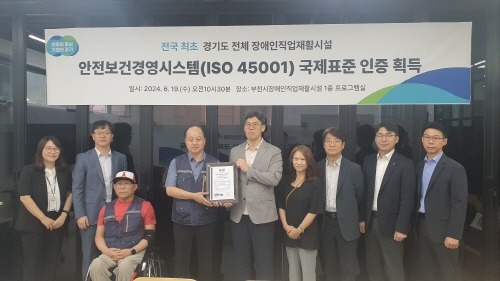 경기도는 19일 부천시장애인직업재활시설에서 ISO45001 국제표준 인증 수여식을 진행했다. ISO45001은 산업재해 예방과 최적의 작업환경을 유지를 위한 안전보건경영시스템으로 국제표준 인증이다.
