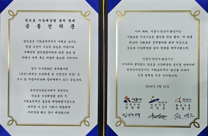 앞서, 화성시는 지난 5월 개최된 경기도 주관 경기 서부 SOC대개발 구상 관련 시·군 현장 릴레이 간담회에서 도에 탄도호 수상태양광 발전 추진 반대 의견을 전달한 바 있다.