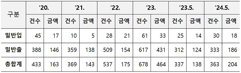 관세청은 올해 들어 적발된 외화 휴대 밀반출입이 363건, 적발금액은 204억 원으로 전년동기대비 약 47.8% 증가했다고 밝혔다.