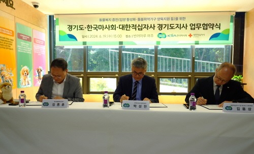 경기도는 19일 반려마루 여주에서 한국마사회, 대한적십자사 경기도지사와 ‘유기·반려동물 물품꾸러미 지원사업’ 업무협약을 맺고 돌봄취약가구의 반려동물 양육지원과 유기동물 입양 활성화 등에 협력하기로 했다.