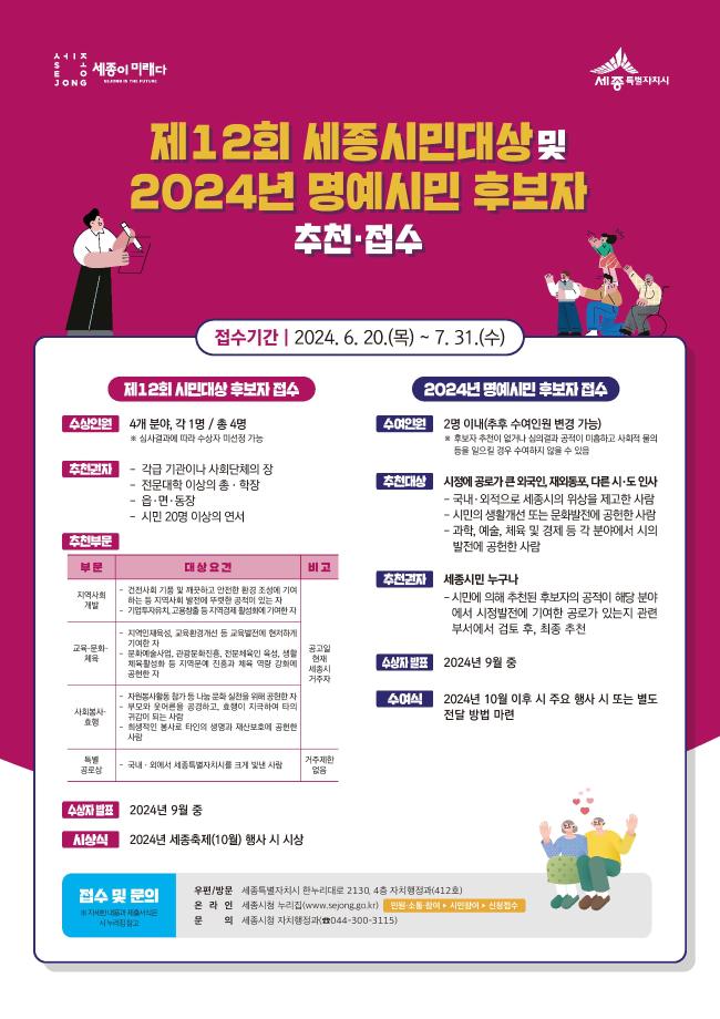 - 7월 31일까지 제12회 세종시민대상, 2024년 명예시민 후보자 접수 -