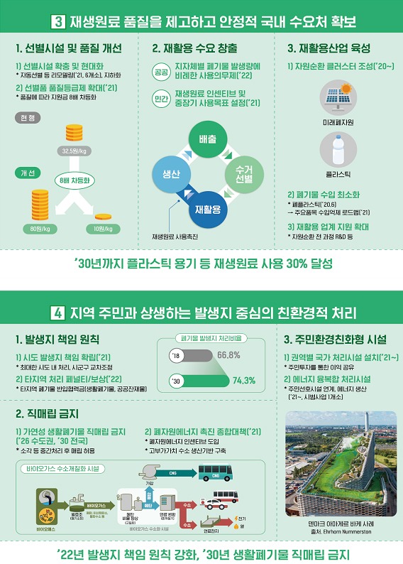 선별·재활용 단계에서는 선별품 품질을 개선, 부가가치가 높은 방식으로 재활용을 촉진하고 만들어진 재생원료, 재활용제품의 안정적인 국내 수요처를 창출한다. 이를 위해 내년에는 재생원료 지원책(인센티브), 2022년에는 공공부문 재활용제품 의무사용을 도입한다.