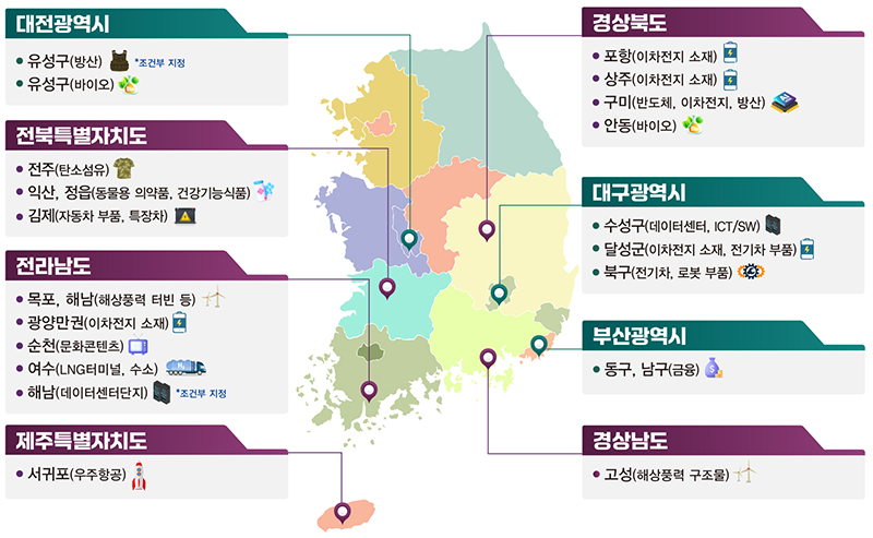 대전광역시는 바이오, 방산 기업들이 유치된 유성구에 위치한 2개 입지 총 60만 3000평으로, 경상남도는 해상풍력 하부구조물 투자가 예정된 고성 내 입지 47만 6000평을 지정했다.