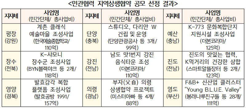 민간과 지역이 손잡고 지역특화 발전 이끄는 민관협력 지역상생협약에 9곳이 최종 선정됐다.
