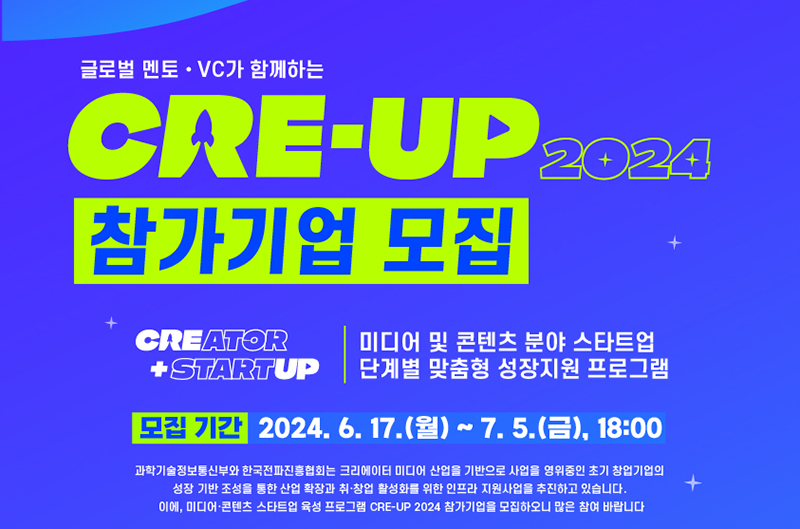 이에 올해도 ‘제2의 트웰브랩스’ 발굴을 위해 미디어·콘텐츠 스타트업 육성 프로그램인 ‘CRE-UP 2024’를 추진해 20개 스타트업을 선정·지원할 계획이다.