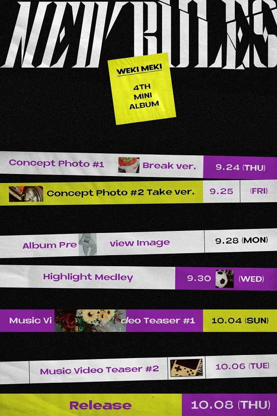 위키미키의 네 번째 미니앨범 ‘NEW RULES’는 ‘화려하고 강렬한 것뿐만 아니라 자유롭고 와일드한 것 또한 위키미키가 추구하는 Girl Spirit’임을 선보일 예정이다. 이 가운데 스케줄러에는 정적인 아름다움이 느껴지는 ‘꽃, 케이크’와 활동적이고 스포티함을 나타내는 ‘자동차, 축구공’ 등의 이미지가 함께 나열되어 앨범의 콘셉트에 대한 호기심을 자극한다.