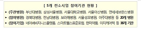 이 사업은 민간병원의 방대한 임상데이터를 활용해 치료기술 개선, 신약개발 등 연구를 지원하는 것으로, 지난 8월 중대형 의료기관을 대상으로 공모를 실시한 결과 5개의 컨소시엄이 사업 참여기관으로 선정되었다.