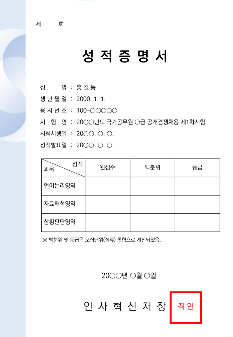 인사혁신처는 내년 시행하는 5·7급 국가공무원 공채 1차시험부터 성적증명서를 발급할 예정이라고 24일 밝혔다.