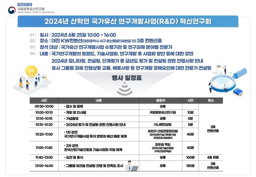 국가유산청 국립문화유산연구원은 6월 25일 오전 10시 대전 KW 컨벤션센터(대전 서구)에서 국가유산 연구개발사업(R&D)인 ‘국가유산 스마트 보존활용 기술개발’ 연구과제 수행기관 관계자 100여 명을 대상으로 사업의 정책방향 및 기술사업화 방안에 대한 강연과 전문가 상담(컨설팅)을 진행하는 혁신연구회를 개최한다.