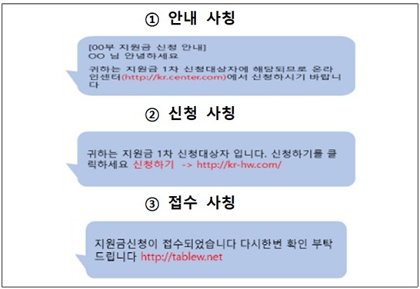 정부가 4차 추가경정예산 관련해 사칭한 스미싱이 증가할 것으로 예상돼 이용자들에게 “지원대상이 아닌 이용자가 문자를 받은 경우 클릭하지 말고 바로 삭제하고, 지원 대상자는 스미싱 문자인지 여부 확인 등 인터넷주소(URL)클릭에 세심한 주의가 필요하다”고 당부했다.