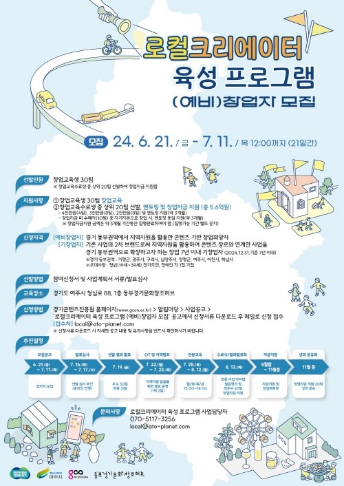 경기도가 경기콘텐츠진흥원 동부경기문화창조허브와 함께 로컬크리에이터의 육성 및 창업을 지원하는 ‘2024년 로컬크리에이터 육성 프로그램’ 참여자 30팀을 오는 7월 11일까지 모집한다.