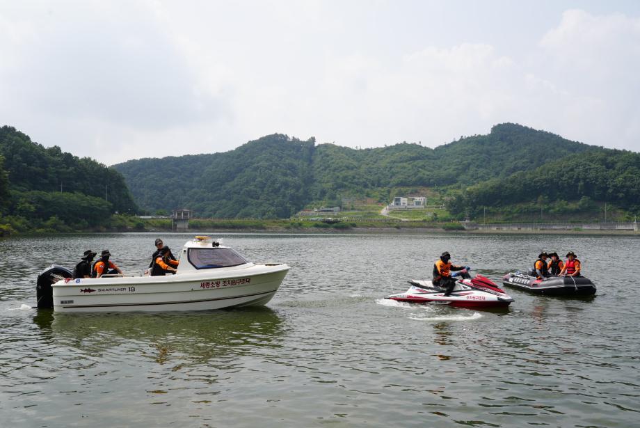 조치원소방서가 지난 24일 본격적인 장마와 여름 휴가철이 다가오면서 빈번하게 일어나는 수난사고를 대비해 연서면 고복저수지 일원에서 특별구조 훈련을 진행했다.
