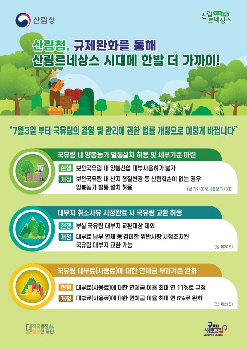 개정안의 주요내용으로는 △보전국유림 내 벌통 설치허용 △대부지 취소사유 조치 완료 시 국유림 교환 허용 △대부료(사용료)에 대한 연체금 부과기준 완화 등이다.